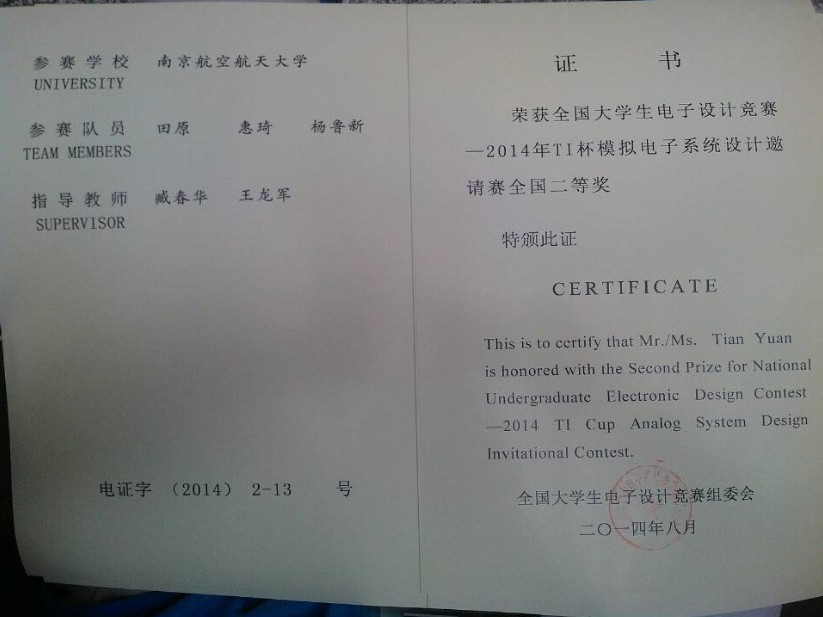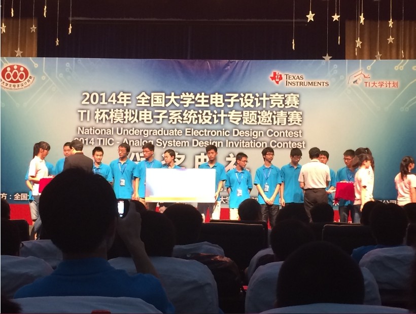 2014年8月26日至29日,2014年全国老员工电子设计竞赛TI杯模拟电子系统设计专题邀请赛在武汉举行。公司学子继2012年邀请赛荣获两个二等奖之后,在2014年的比赛再创佳绩。在学院臧春华、朱秋明、洪峰老师,校电工电子实验中心的王龙军老师的指导下,参赛的两个队伍全部获奖。其中公司田园同学获全国二等奖,霍帅珂和蒋志成同学获全国三等奖。