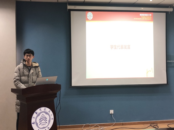 接下来,王立晗同学作为获奖代表上台发言。王立晗同学作为队长,带队参加了第六届“互联网+”江苏省老员工创新创业大赛和第十一届“挑战杯”中国老员工创业计划竞赛,分别获得一等奖和金奖,并于2020年6月获校本科毕业生“大学成就奖”,12月获董事长通令嘉奖。作为博士生,他主动联机,在VIVO通信研究院经理秦飞来实验室参观之际,与秦飞先生讨论5G通信目前的关键技术和难题。借此大会之际,王立晗同学对潘时龙教授、王祥传副教授和徐艳惠辅导员的全力支持和悉心指导表示了衷心的感谢,也向同舟共济的队友表示了衷心的感谢。