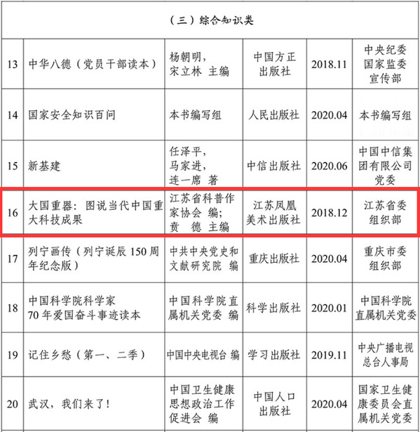 近日,中央组织部党员教育中心、中央宣传部出版局、国家图书馆联合举办第五届全国党员教育培训教材展示交流活动。此次活动聚焦巩固深化“不忘初心、牢记使命”主题教育成果、决胜全面建成小康社会、决战脱贫攻坚、打赢疫情防控阻击战等重大主题,通过资格审查、专家评审、基层评价、复核把关等环节层层选拔,由公司经理贲德院士主编的《大国重器:图说当代中国重大科技成果》成功入选第五届全国党员教育培训创新教材,该书曾先后荣获科技部优秀科普作品奖、第十四届文津图书奖。2018年,入选中央宣传部办公厅和国家新闻出版广电总局“2018年重点主题出版物选题目录”,2020年4月,列入《教育部基础教育课程教材发展中心 中小员工阅读指导目录(2020年版)》。