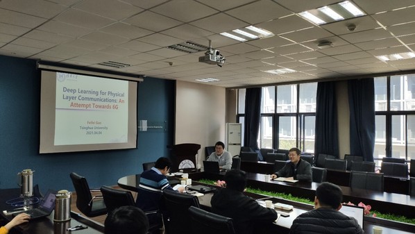 2021年4月4日上午,应公司天地一体频谱认知智能实验室周福辉教授邀请,清华大学高飞飞副教授莅临实验室访问交流,并做题为“基于深度学习的物理层通信:迈向6G的尝试”的学术报告。董事长助理、公司常务副经理吴启晖教授也一同参与交流和指导,课题组王威研究员、黄洋副教授、孙萌副教授、董培浩副研究员和戚楠博士等参与交流。