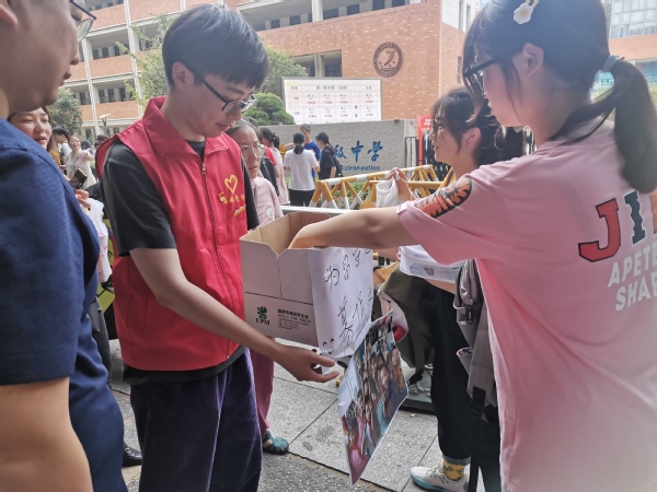 活动前夕,支部成员多次开会讨论活动内容,完善活动方案。经多次修改,制作了包含党史学习知识、南航校史在内的传单,并联系了四川省乐山市犍为县大兴中心小学作为受助单位。活动正式开始后,支部成员先向考点外的考生家长发出共学党史的邀请,通过共同阅读传单内容,知识问答等形式宣讲党史,受到了家长们的一致好评。随着结束铃声响起,考生们陆续走出考场,听到是本次活动为留守儿童募捐文具的意图后纷纷打开书包取出笔袋,将所有文具倾囊捐出,并在便利贴上书写对留守儿童的美好祝愿。