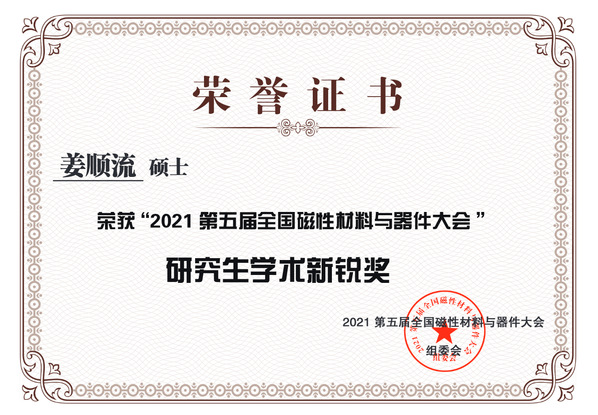 大会上课题组硕士生姜顺流做了题为“基于磁性材料的可重构反射型吸波体及其在低散射天线中的应用”的报告,展示了一种设计RCS可重构天线的方法。该设计依托一款磁性材料构建可重构反射型频率选择吸波体(FSA),其可重构特性由PIN管的通断控制;随后,该结构加载螺旋天线构建天线反射面,不仅实现带内带外RCS可重构,还能保持天线原有的辐射特性。PIN管在两种工作状态下,天线旁瓣均得到有效抑制。凭借此报告的创新性和科技性,姜顺流同学与北京大学、清华大学、上海交通大学研究生一道(共计12人)荣获了本届大会的“研究生学术新锐奖”。