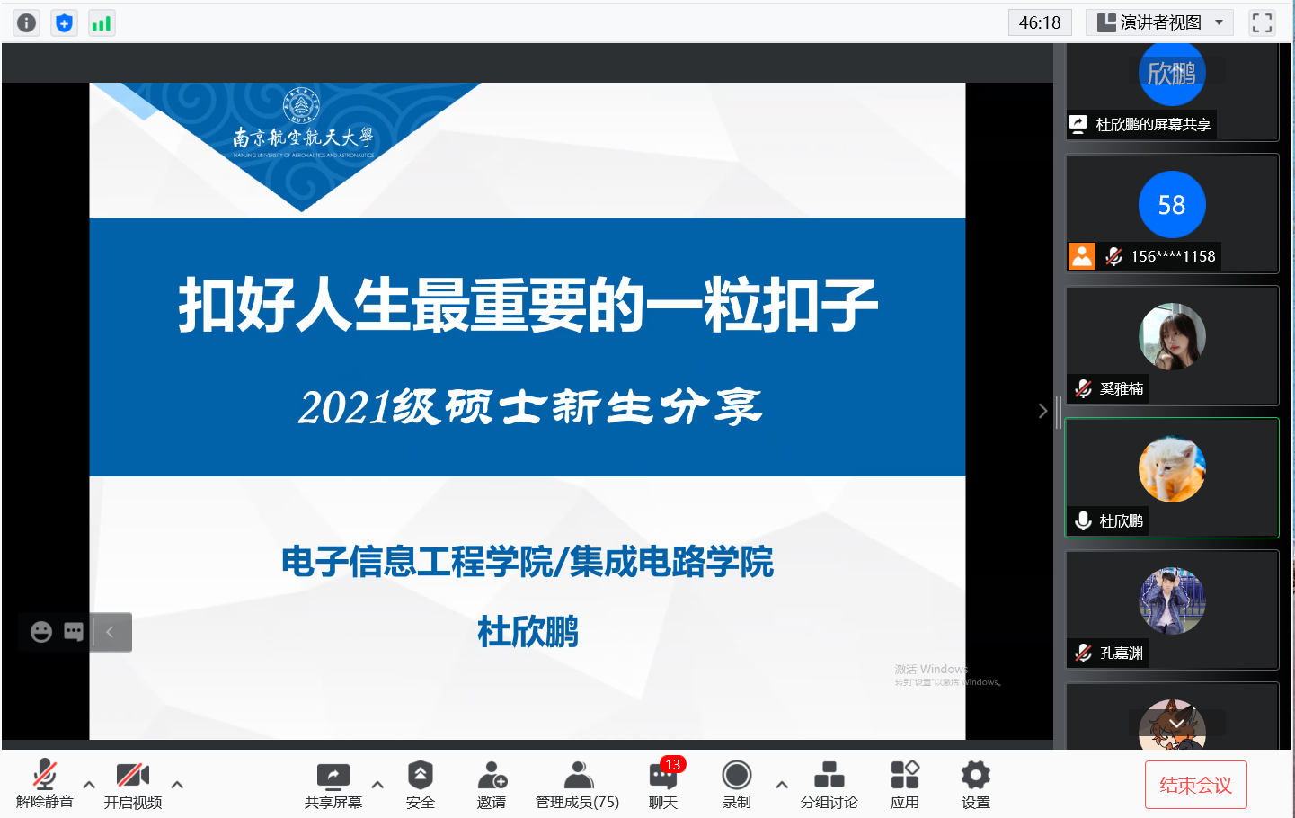 最后研究生辅导员杜欣鹏老师以“扣好人生最重要的一粒扣子”为题带来自己的职业生涯规划经历分享。杜老师以南航的发展历史和校训作为切入点,首先帮助新生们认识南航了解南航,树立新生对学校、学院的价值认同感和归属感。随后杜老师根据自身的读研经验告诫新生们读研期间要首先进行多维度信息获取和筛选,提早做好选择,选择比努力更重要。最后,杜老师为同学们分析学院近年来毕业生就业去向和各类就业数据,并对同学们提出的问题进行一一解答,帮助同学们提早布局,积极开展个人职业生涯规划。