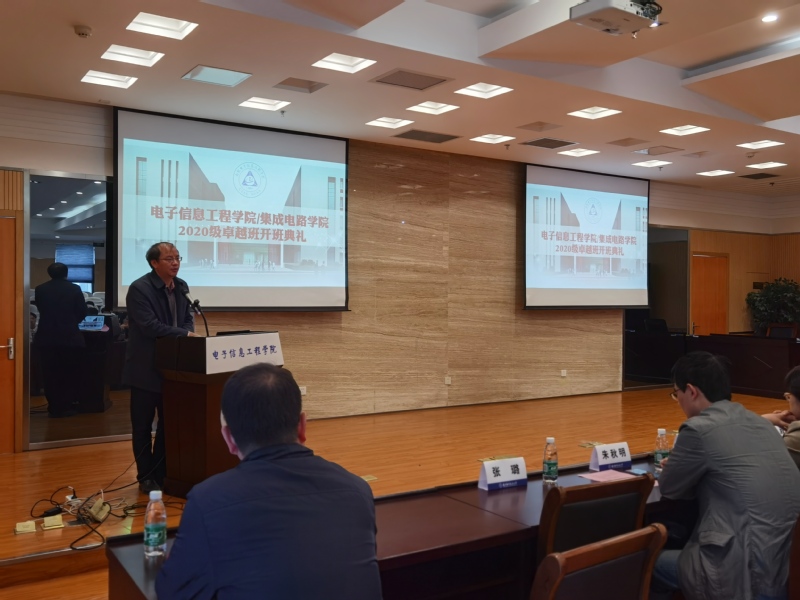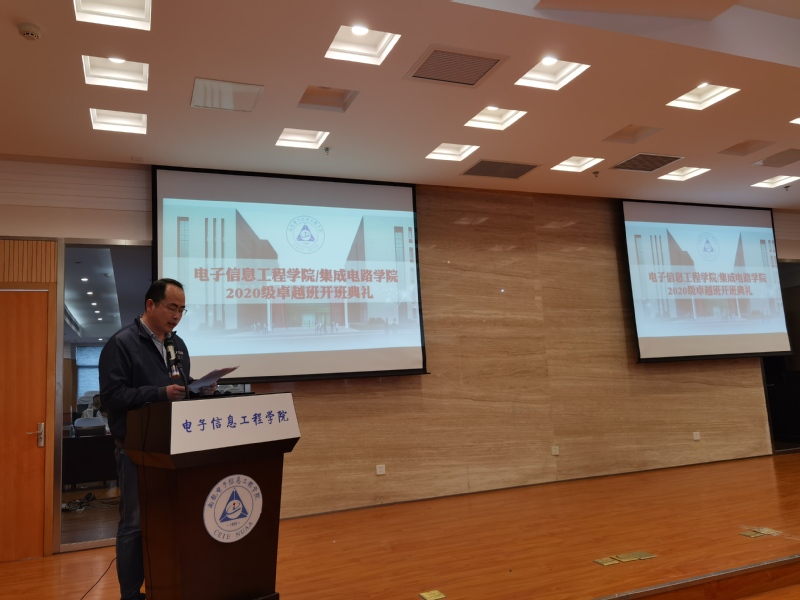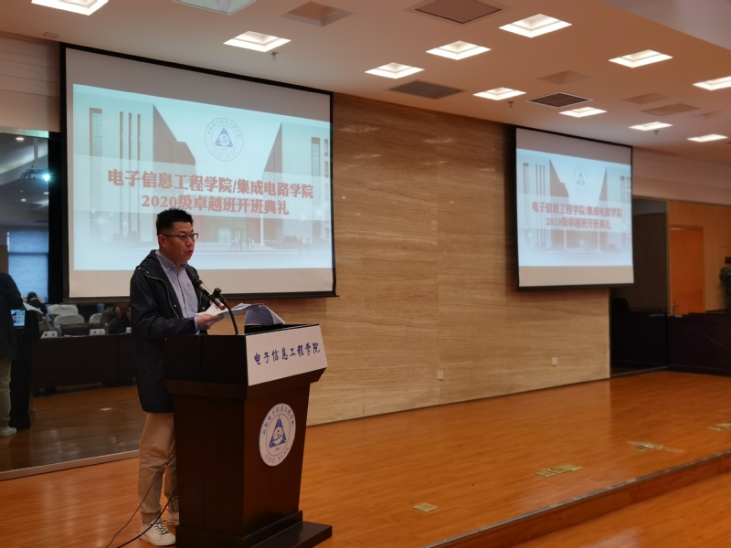 11月4日,威廉希尔官网/集成电路学院2020级本科生卓越工程师班开班典礼在学院515报告厅顺利举行,经理助理牛臻弋、电子科学与技术系系主任刘冰、系副主任王毅、信息与通信工程系系主任夏伟杰、实践教育中心副主任邱旦峰、2020级卓越班班主任胡志忠、朱秋明、企业代表中兴通讯股份有限公司行业总工张慧、南京华成微波技术有限公司总经理任波等出席典礼,2020级全体卓越班员工参加典礼。典礼由牛臻弋主持。