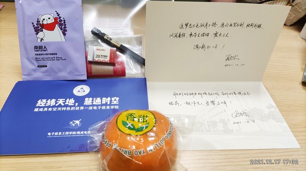 紧接着,老师为考研学子送上了学院特制的 “加油大礼包”,包括考场上需要的文具、缓解疲惫的蒸汽眼罩以及寓意着事 事如意的柿子。最特别的是,每一位考研学子都收到了由学院精心设计的祝福卡片,上面印着公司党委书记聂东林及常务副经理潘时龙亲笔为每位学子写的专属祝福语,希望考研学子执笔为剑,披荆斩棘,一鼓作气,永攀高峰!