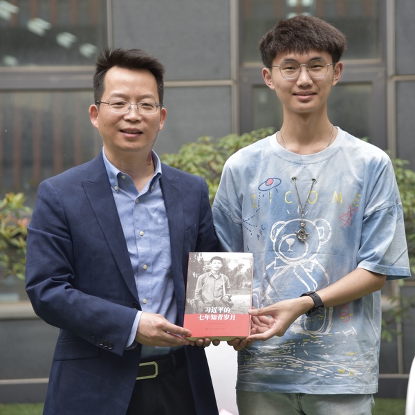 最后,刘宇雷向团支部赠书《习近平的七年知青岁月》。他表示,时年15岁的习近平总书记下乡7年,经过了“饮食关”、“跳蚤关”、“劳动关”、“思想关”的考验,同梁家河人民同甘共苦,水乳交融,并初步确立了人民至上的价值理念,我们要以总书记为榜样,胸怀理想、胸怀人民,在青少年这个拔节育穗期扣好人生的第一粒扣子。他倡导同学们把读书变成习惯,变成终生的爱好,读万卷书,行万里路,在书中体验生活、感受温暖,通过读书更多地了解世界、洞察世界;更要学会思考,用习近平总书记提出的六个思维来分析问题解决问题,争做有思想有态度的新青年。