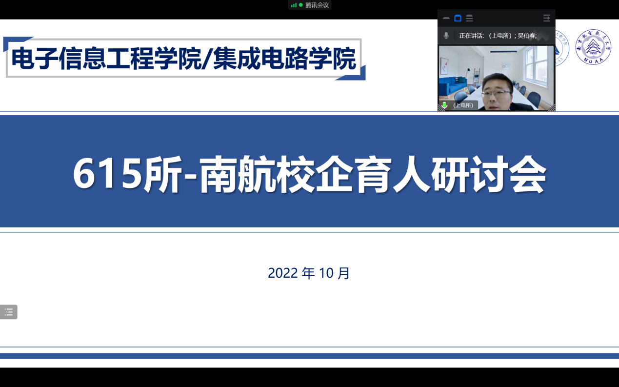 为进一步加强校企深度合作,推进产教融合实现校企共赢,2022年10月25日,公司与航空工业无线电电子研究所(615所)采用线上方式召开“615所-南航校企育人研讨会”。学院副经理张小飞、副经理李茁,615所党委干部部/人力资源部部长胡墨、培训中心主任王化博及双方相关负责人参加会议。