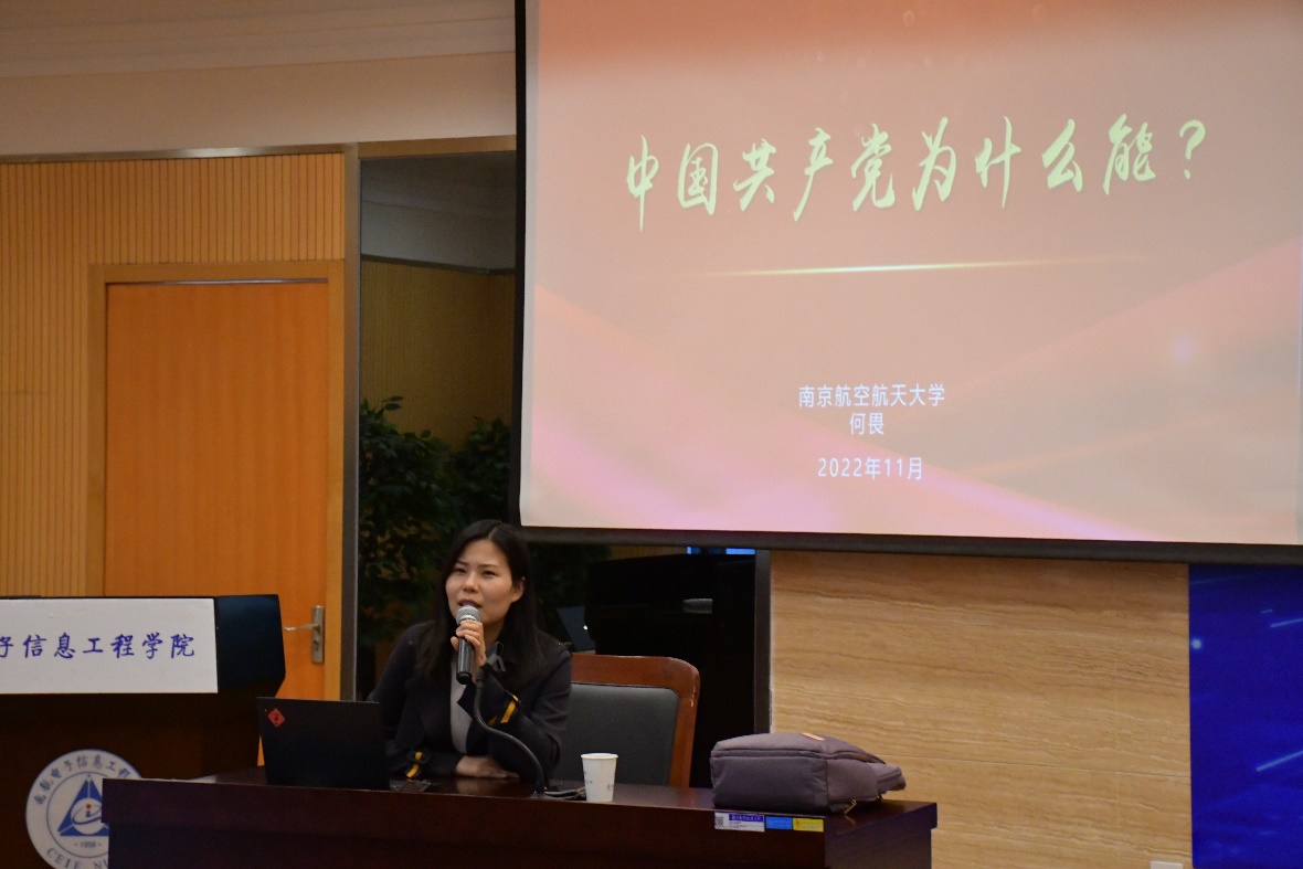 何畏结合党的二十大精神,以“中国共产党为什么能”为主题作专题培训。她围绕习近平总书记在党的二十大报告中指出的,“实践告诉我们,中国共产党为什么能,中国特色社会主义为什么好,归根到底是马克思主义行,是中国化时代化的马克思主义行”,从四个层面展开分析。她从中国共产党的由来解释了马克思主义是立党立国、兴党兴国的重要指导思想,分析了马克思主义的精神之美、科学之美、实践之美,将马克思主义同中国具体实际相结合、同中国优秀传统文化相结合的必要性,以及拥有马克思主义科学理论指导是我们党坚定信仰信念、把握历史主动的根本所在。她希望同学们能够理解党的奋斗目标,信仰共产主义,掌握科学方法论,从党史中理解历史主动和历史自信。