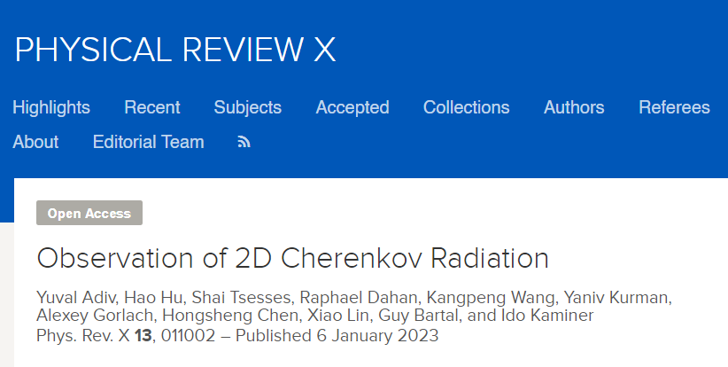 近日,公司特聘研究员胡昊博士与以色列理工大学Ido Kaminer教授团队、浙江大学林晓教授团队合作,在国际知名物理学期刊Physical Review X上以“Observation of 2D Cherenkov Radiation”为题发表学术论文。该工作是国际上首次在二维尺度实现切伦科夫辐射,同时刷新自由电子辐射耦合强度记录并揭示其量子特性。以色列理工大学Yuval Adiv博士为论文第一作者,公司特聘研究员威廉希尔官网胡昊博士和以色列理工大学Shai Tsesses博士后为论文共同第一作者,Ido Kaminer教授为论文通讯作者。